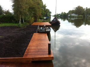 TMG Grondwerken heeft jarenlange ervaring in het aanleggen van vlonders ten behoeve van veranda of terras, maar ook als steiger is de vlonder een populaire toepassing. TMG maakt daarbij ook gebruik van duurzaam FSC Hardhout en composiet. Veelal wordt een antislip profiel toegepast uit het oogpunt van veiligheid. TMG denkt met u mee om in uw specifieke situatie de beste oplossing te leveren!